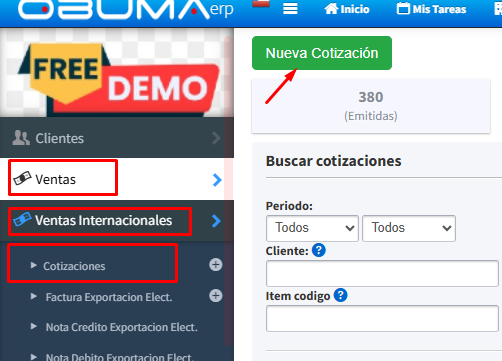 Modulo de VENTAS > Ventas Internacionales > Cotizaciones > Nueva Cotización