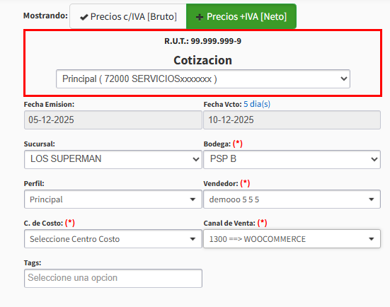 - Perfil : OBUMA permite emitir cotizaciones con perfiles de fantasia distintos, logos y nombres de fantasia distintos al principal de la empresa. Si es el caso, debes seleccionar el perfil al que pertenece la cotización.